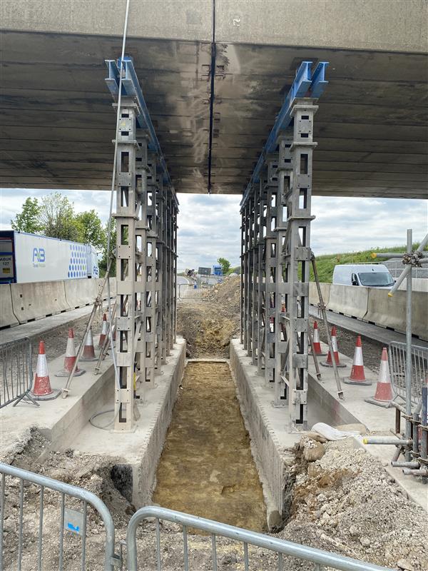 Alongside the primary propping design, a suite of temporary works was developed to support delivery, including excavation support adjacent to the carriageway, formwork for new footings and pier construction, and access systems. Each element was considered in the context of the overall sequence, with stability maintained at critical stages throughout.